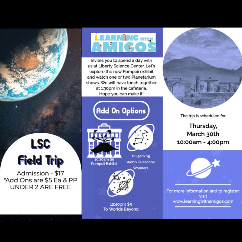 We plan several field trips per month. We have partnered with Liberty Science Center to provide classes to the homeschool community. This year we attended homeschool classes at LSC twice per month in the Fall and once per month in the spring.